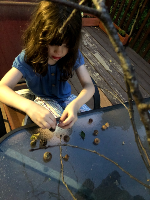 That evening, I took the little girls on a Sunset Nature Walk. We picked up acorns, pecans, leaves, and sticks. We played with what we found on the back deck until well after dark.